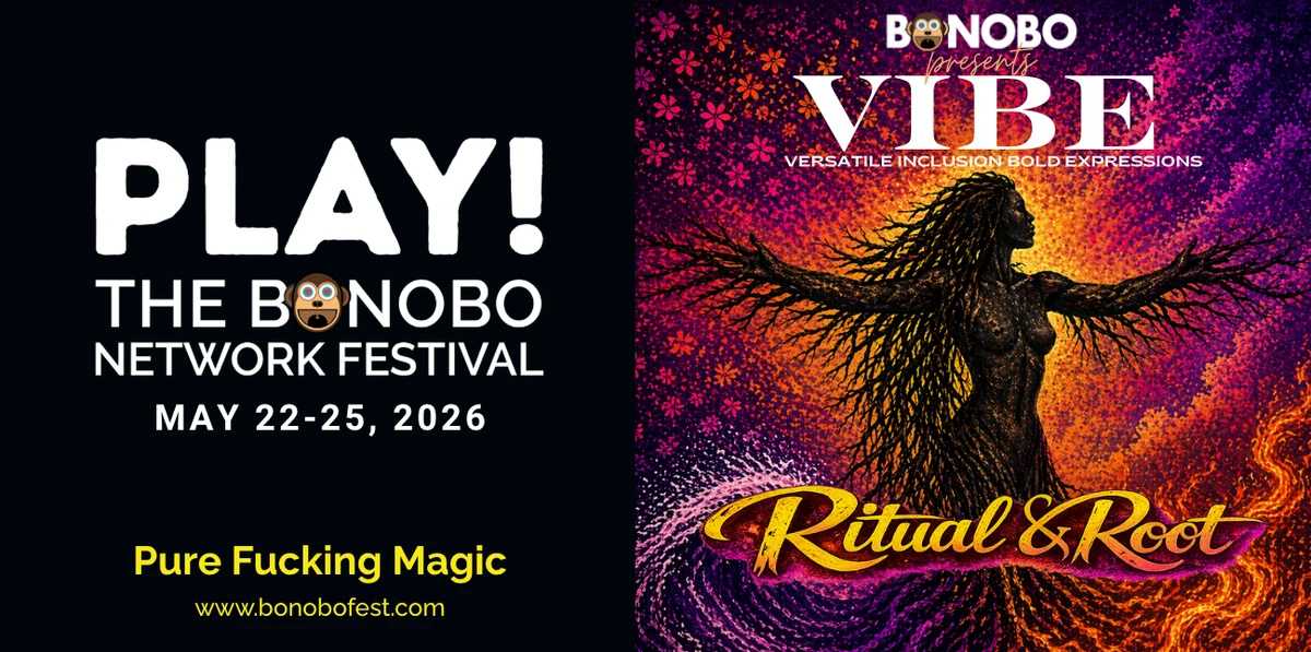 I’m thrilled to announce that we’re hosting Ritual & Root, an exclusive VIBE BIPOC‑only play event at Bonobofest on Saturday, May 23rd — and this one is special. It’s the first time BonoboFest has ever offered a BIPOC‑only play party, and we’re honored to bring this moment forward.