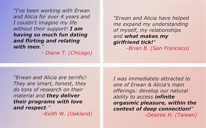 Erwan & Alicia have been supporting singles & couples in having amazing love lives since 1995, and this workshop is an opportunity to experience their teaching. It is an open session of Erwan & Alicia’s most popular program, Mastery of Relationship, and is designed for those new to The Davon Method that are seeking support in their love lives. The experience will provide you with a taste of the program, and you will have an opportunity to learn more about how you can sign up for Mastery of Relationship and take your love life to the next level.