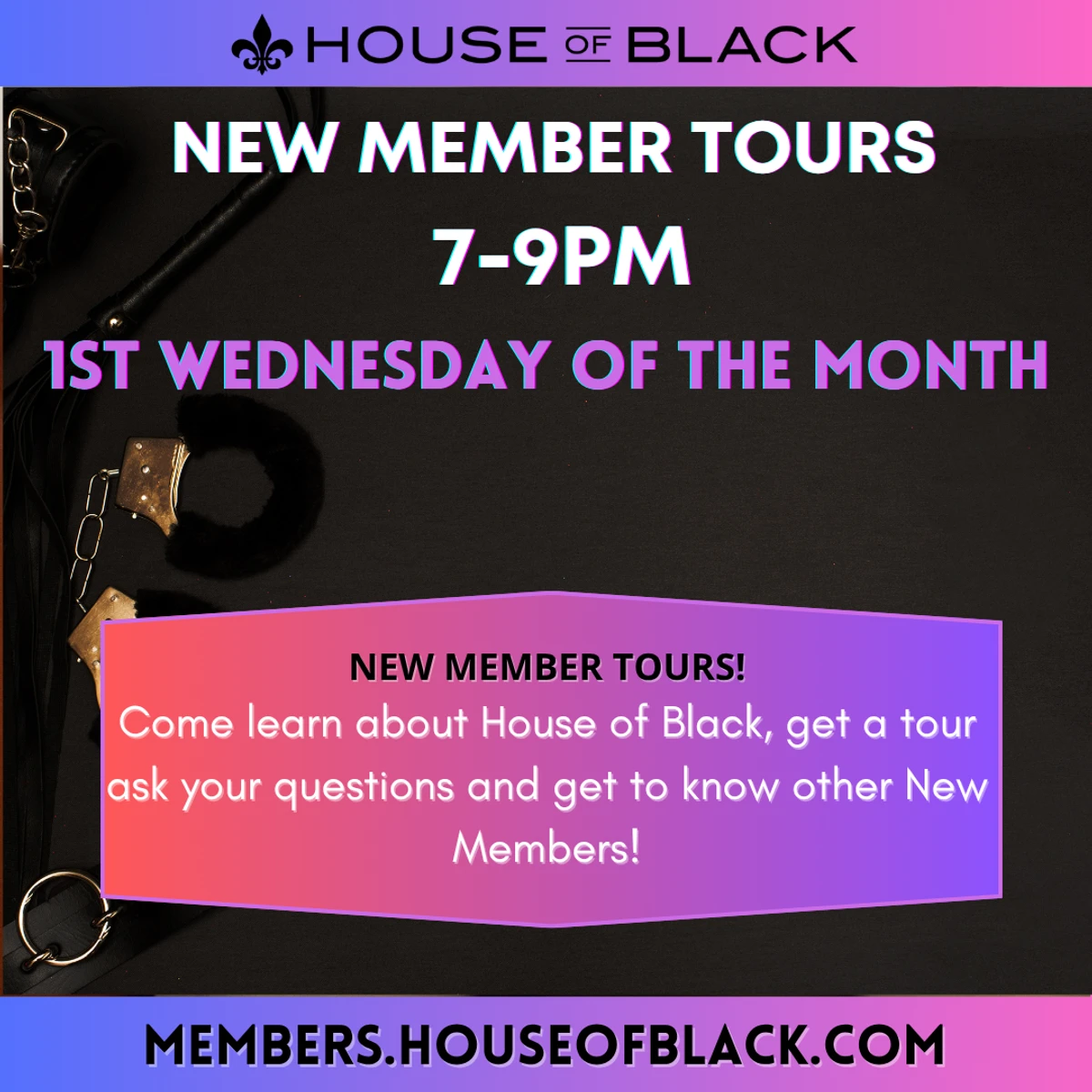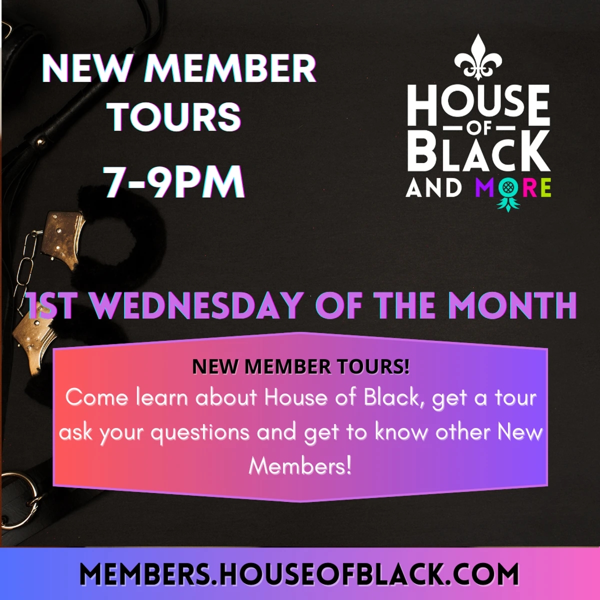 Come learn about House of Black, our policies, our events, get a tour, learn about sex positive community etiquette, understand basics on Kink, Swinging, etc and ask your questions!