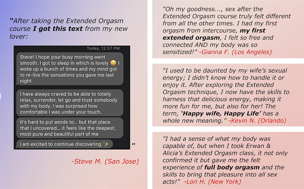 You will walk away with a profound somatic understanding of Tantra and practical ideas to enhance both your own and a partner's pleasure! Erwan and Alicia have cultivated an environment that fosters ease and comfort in exploring one of life's greatest pleasures—sensual connection—taken to new heights.