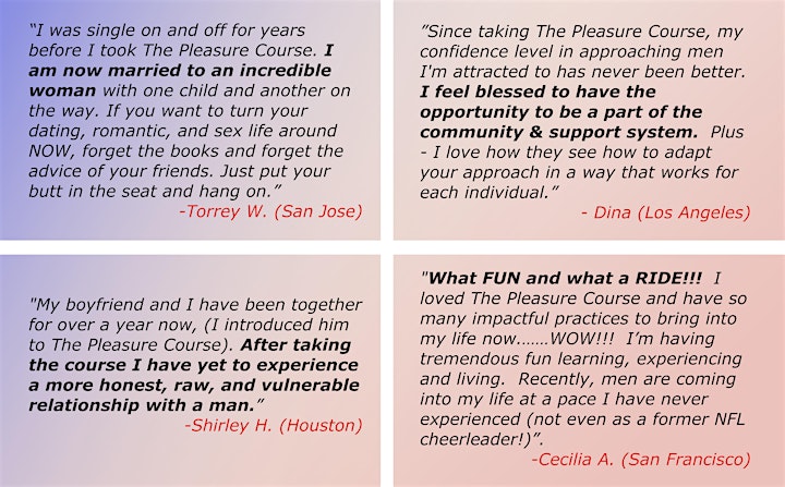 The Pleasure Course online is a two-day online seminar that will help anyone – from singles to those in long-term relationships – discover your "relationship blueprint" (read: unconscious patterning) and learn to transcend it. You can then learn to create and sustain an “eternal date” with your partner – a romantic relationship that reaches higher and higher peaks of intimacy, sexual attraction and spiritual union over time.